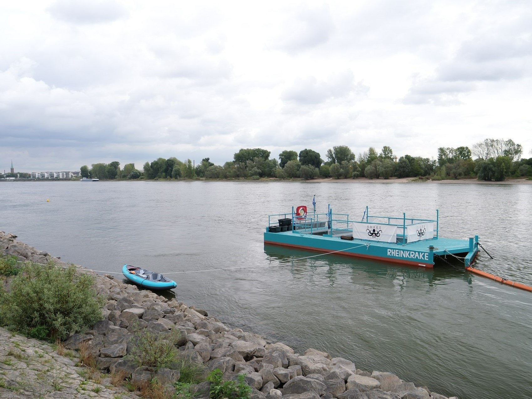 Verankert ist die Rheinkrake linksrheinisch, nördlich der Kölner Zoobrücke, bei Rheinkilometer 690,30. Aufgrund der Rheinbiegung ist die Strömung hier besonders günstig, um möglichst viel Abfall abzufangen. Das Einfangen gelingt der schwimmenden Müllfalle mit einem Fangkorb, der zwischen zwei Schwimmkörpern befestigt und entgegen der Fließrichtung geöffnet ist. Dabei ist der Korb so konstruiert, dass er an der Wasseroberfläche treibendes Plastik erfasst – nicht aber zur Gefahr für Fische und Vögel wird. Einmal pro Woche wird der Verein die Rheinkrake dann ausleeren, den Müll an Land erfassen und in Kooperation mit der Universität Bonn wissenschaftlich auswerten. Mit den Erkenntnissen wollen die Umweltschützer eine Langzeitstudie zum Plastikmüll im Rhein durchführen.