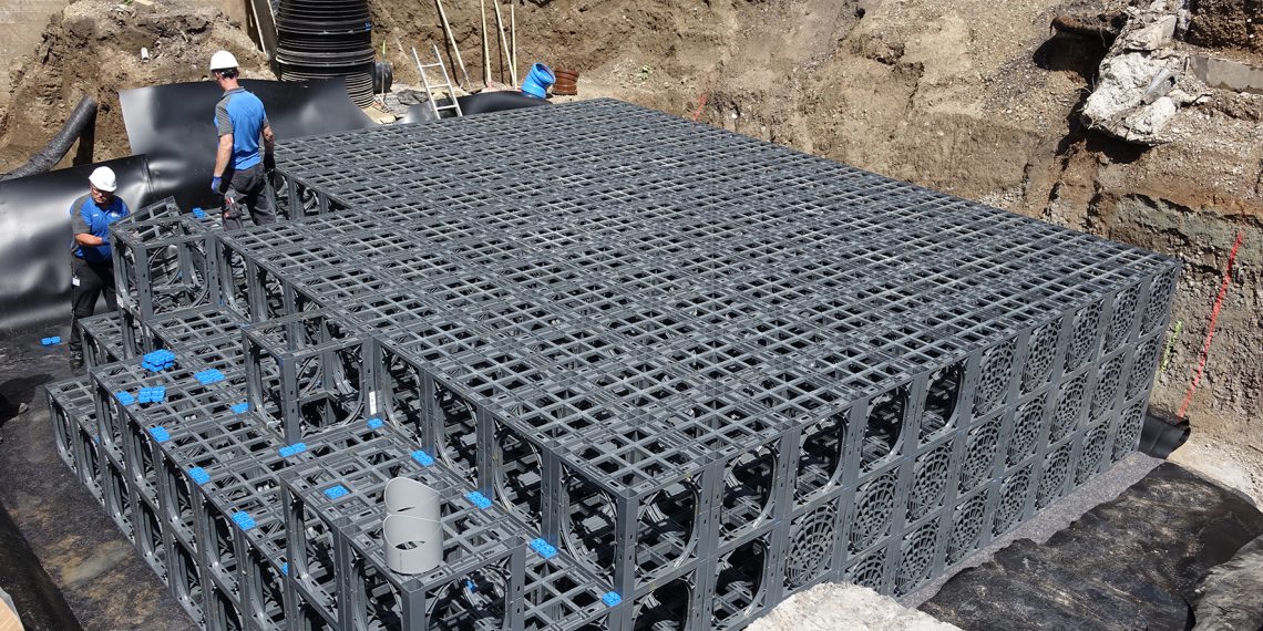 Um eine Überlastung des bestehenden Kanals bei Starkregen zu verhindern, hatten die Göttinger Entwässerungsbetriebe zur Auflage gemacht, dass das Niederschlagswasser vom Dach der Stadthalle und von der Fläche ringsherum nur gedrosselt in den bestehenden Regenwasserkanal eingeleitet werden darf. Die Stadt Göttingen, als Auftraggeber für die Sanierung der Stadthalle, beauftragte daher die ortsansässige Bürogemeinschaft Hesse/Temme mit Planungen zur Regenableitung und ‑rückhaltung. In der Vergangenheit hatte das Büro bei anderen Baustellen bereits gute Erfahrungen mit Produkten von Funke Kunststoffe gesammelt. Daher setzte man auch mit Blick auf die Göttinger Stadthalle auf die Systemlösungen des Herstellers: Zum Einsatz kamen HS-Kanalrohre, eine Sedimentationsanlage, ein Entnahmeschacht, ein Drosselschacht sowie ein unterirdischer Retentionsraum mit L/B/H 7,20 x 7,20 x 1,80 Meter. Letzterer besteht aus insgesamt 432 D‑Raintank 3000-Elementen und wurde dreilagig eingebaut und mit einer Kunststoffdichtungsbahn (KDB) aus PE-HD wasserdicht verschweißt. Damit konnte vor der Stadthalle in Göttingen ein unterirdisches Regenauffangvolumen von rund 93 Kubikmeter geschaffen werden.