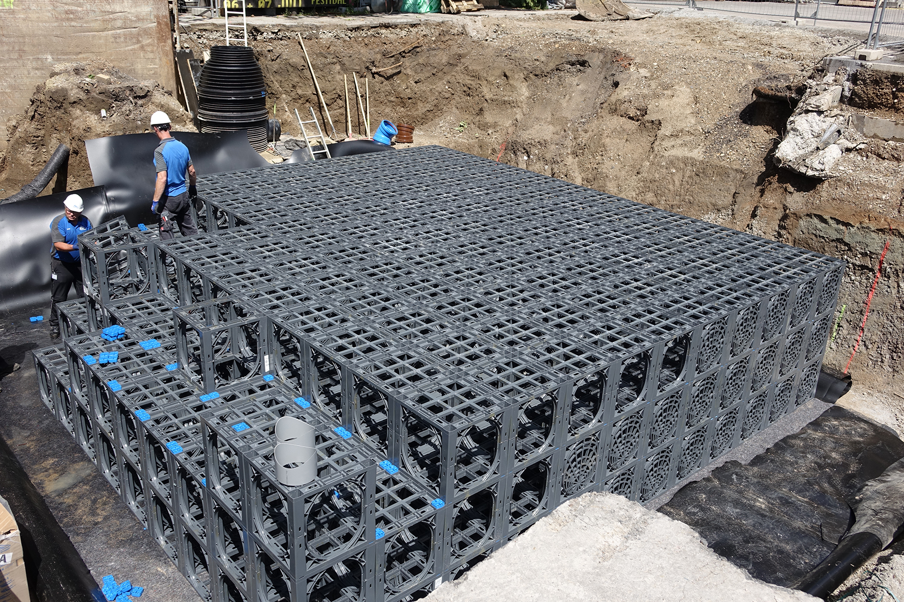 Um eine Überlastung des bestehenden Kanals bei Starkregen zu verhindern, hatten die Göttinger Entwässerungsbetriebe zur Auflage gemacht, dass das Niederschlagswasser vom Dach der Stadthalle und von der Fläche ringsherum nur gedrosselt in den bestehenden Regenwasserkanal eingeleitet werden darf. Die Stadt Göttingen, als Auftraggeber für die Sanierung der Stadthalle, beauftragte daher die ortsansässige Bürogemeinschaft Hesse/Temme mit Planungen zur Regenableitung und ‑rückhaltung. In der Vergangenheit hatte das Büro bei anderen Baustellen bereits gute Erfahrungen mit Produkten von Funke Kunststoffe gesammelt. Daher setzte man auch mit Blick auf die Göttinger Stadthalle auf die Systemlösungen des Herstellers: Zum Einsatz kamen HS-Kanalrohre, eine Sedimentationsanlage, ein Entnahmeschacht, ein Drosselschacht sowie ein unterirdischer Retentionsraum mit L/B/H 7,20 x 7,20 x 1,80 Meter. Letzterer besteht aus insgesamt 432 D‑Raintank 3000-Elementen und wurde dreilagig eingebaut und mit einer Kunststoffdichtungsbahn (KDB) aus PE-HD wasserdicht verschweißt. Damit konnte vor der Stadthalle in Göttingen ein unterirdisches Regenauffangvolumen von rund 93 Kubikmeter geschaffen werden.