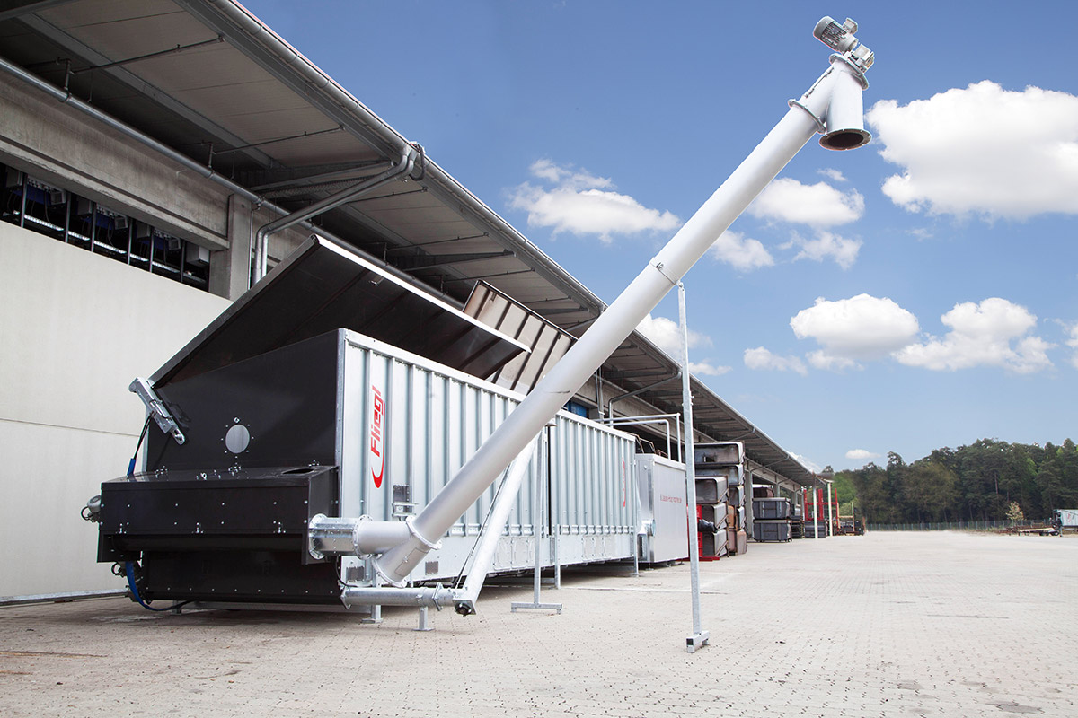 Die Beschickung mit entwässertem Klärschlamm kann sowohl in Chargen als auch kontinuierlich erfolgen. Je nach Einsatz-Situation lässt sich die Anlage also entweder per Radlader beschicken oder auch direkt in Produktionsprozesse einbinden. Das getrocknete Substrat kann über eine angeflanschte Hochförderschnecke oder eine schwenkbare Auslaufrutsche in Kipper, Container etc. überladen und dann zur weiteren Verarbeitung bzw. Nutzung abtransportiert werden.