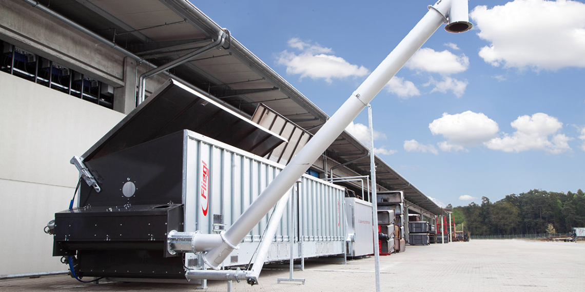 Die Beschickung mit entwässertem Klärschlamm kann sowohl in Chargen als auch kontinuierlich erfolgen. Je nach Einsatz-Situation lässt sich die Anlage also entweder per Radlader beschicken oder auch direkt in Produktionsprozesse einbinden. Das getrocknete Substrat kann über eine angeflanschte Hochförderschnecke oder eine schwenkbare Auslaufrutsche in Kipper, Container etc. überladen und dann zur weiteren Verarbeitung bzw. Nutzung abtransportiert werden.