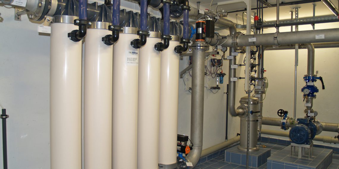Nach der Entsäuerung gelangt das Wasser zur Multibarriere: Sie besteht aus einer Ultrafiltrationsanlage (UF-Anlage) und einer UV-Anlage. Die Poren der UF-Membranen sind nur rund 0,02 µm groß — im Vergleich hierzu: ein Haar ist etwa 5.000 Mal dicker. Damit halten die Membranen selbst die kleinsten Partikel und auch mikrobiologische Belastungen wie Viren oder Bakterien nahezu vollständig zurück (99,999 Prozent). Die UF-Anlage besteht aus fünf Modulen mit jeweils 60 m² Membranfilterfläche. Jedes Modul kann bis zu fünf Kubikmeter Reinwasser pro Stunde produzieren. Dadurch ist auch bei nur vier intakten Modulen die maximale Aufbereitungsleistung von 20 m³/h gewährleistet. Diese Leistung entspricht der genehmigten stündlichen Rohwasserentnahmemenge aus dem Tiefbrunnen.