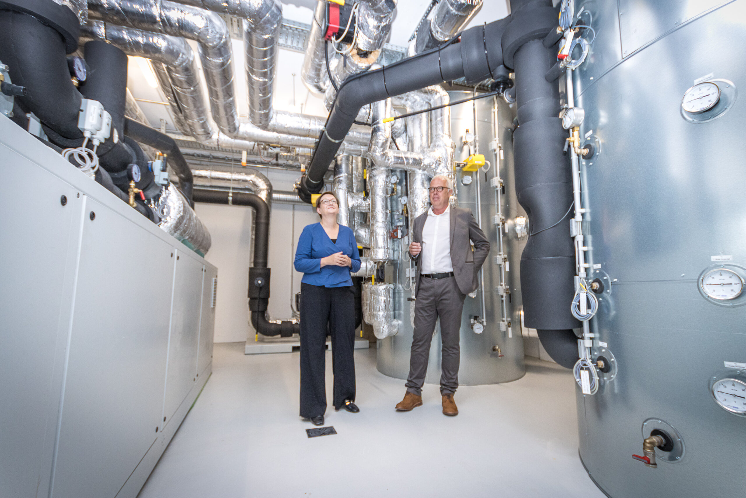 „Es wird immer wichtiger, dass wir bei der Energie- und Wärmev­er­sorgung möglichst viele dezen­trale Lösun­gen haben“, sagte Gey­witz und ergänzte: „Das schafft Resilienz“. Bei ein­er Führung durch die Tech­nik-Räume zeigte sie sich beein­druckt von der Inge­nieursleis­tung und ihrer rel­a­tiv kom­pak­ten Umset­zung, die einen Ein­satz auch im Bestand oder in neuen Woh­nungs­bauquartieren ermöglicht.
