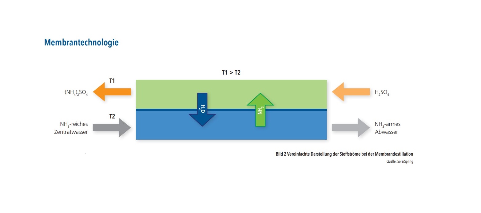 Die Membrandestillation ist ein neuartiges Membranverfahren. Sie wird bei dieser Applikation eingesetzt um Ammonium aus dem Kläranlagenabwasser abzutrennen und dieses simultan in Ammoniumsulfat (Düngemittel) umzuwandeln. Die Abtrennung von Ammonium aus Abwasser ist vor allem für stehende Gewässer eine wichtige Maßnahme zum Schutz vor Eutrophierung. Gelangt Stickstoff in hoher Konzentration in die Gewässer, führt dies zu einem vermehrten Pflanzenwuchs. Das kann anaerobe Verhältnisse im See und somit ein Fischsterben bewirken. Eine Rückgewinnung des Ammoniums und Verwendung als Düngemittel ist somit eine hervorragende Möglichkeit den Stickstoffkreislauf zu schließen.