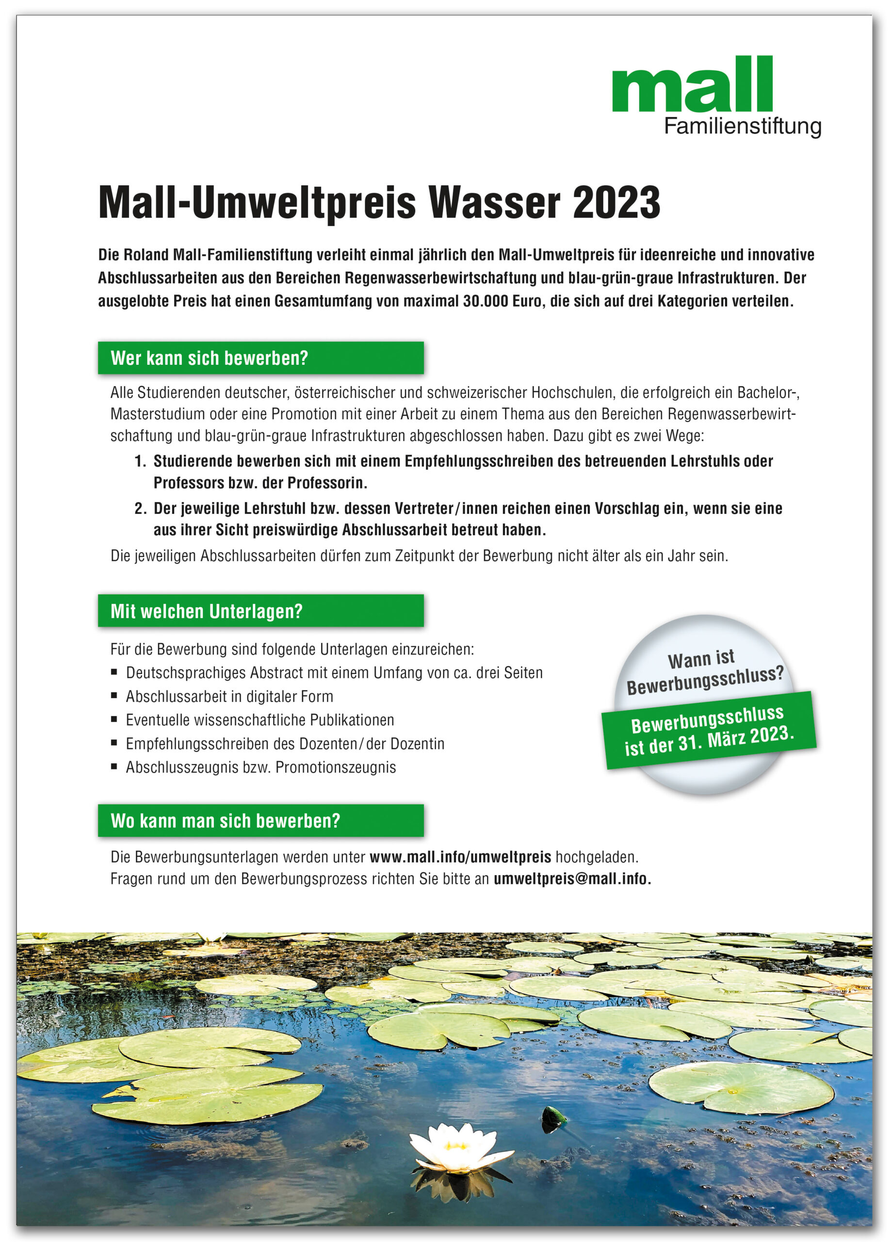 Für ideenreiche und innovative Abschlussarbeiten aus den Bereichen Regenwasserbewirtschaftung und blau-grün-graue Infrastrukturen verleiht die Roland Mall-Familienstiftung ab sofort einmal jährlich den Mall-Umweltpreis. Der ausgelobte Preis hat einen Gesamtumfang von maximal 30.000 Euro, die sich auf die Kategorien Bachelor‑, Masterarbeiten und Dissertationen verteilen.