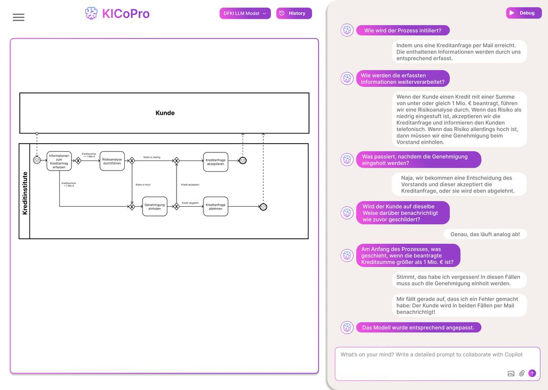 Viele Unternehmen wollen ihre Tätigkeit­en mit dig­i­tal­en Tech­nolo­gien ziel­ge­nau unter­stützen. Geschäft­sprozess­mod­elle spie­len hier­bei – ins­beson­dere bei der Ein­führung entsprechen­der Infor­ma­tion­ssys­teme — eine große Rolle. Ger­ade kleinere und mit­tlere Unternehmen tun sich bei der Erfas­sung und Verbesserung ihrer Prozesse allerd­ings oft­mals schw­er. Im Rah­men des Pro­jek­tes KICo­Pro soll daher ein Chat­bot-basiert­er Mod­el­lierungscopi­lot entwick­elt wer­den, der die Möglichkeit­en neuar­tiger großer Sprach­mod­elle zur Erfas­sung und Verbesserung von Prozessen in Unternehmen nutzt.