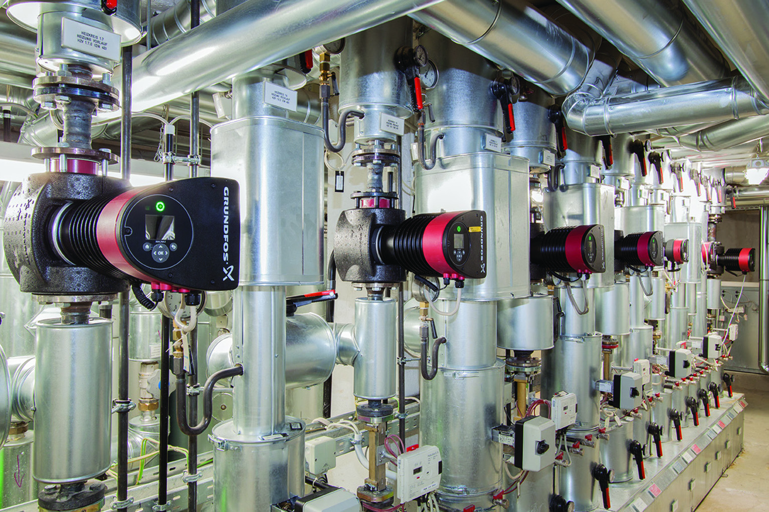 Für die Produktion der Magna3 hat das Unternehmen in Wahlstedt rund 40 Millionen Euro investiert. Die Fertigung basiert auf einem Produktions- und Logistik-Konzept mit durchgängig halb- oder vollautomatisierten Prozessen. Die Montagelinien werden über ein Warehouse-Management mit Staplerleitsystem ‘just in sequence’ direkt aus dem zentralen Lager mit Komponenten versorgt. Auch das Zusammenführen von Pumpengehäuse und Motor mit Laufeinheit erfolgt vollautomatisiert. Bei den Komponenten setzt Grundfos auf eine hohe Fertigungs¬tiefe und produziert beispielsweise Leiterplatten und Wellen selbst. Die Qualitätssicherung arbeitet nach dem japanischen Poka-Yoke-Prinzip. Danach werden bereits im Fertigungsprozess einzelne Teile überprüft, um Fehler frühzeitig erkennen und korrigieren zu können. Dem Thema Energieeffizienz räumt Grundfos auch in der eigenen Produktion hohen Stellenwert ein: Durch den Einsatz einer Staurollenkette spart die Magna3-Fertigungslinie im Vergleich zu herkömmlichen Transportbändern rund 40 Prozent Energie ein.