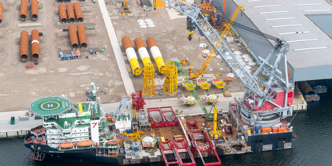 Die Bauarbeiten für Hollandse Kust Zuid beginnen mit der Installation der Monopile-Fundamente. Jedes dieser Fundamente wird speziell für den jeweiligen Standort konstruiert. Der schwerste und größte Monopile wiegt 955 Tonnen und ist 75 Meter hoch, während der leichteste und kürzeste immer noch 735 Tonnen wiegt und 62 Meter hoch ist. Die Monopiles werden in Wassertiefen von 17 bis 28 Metern installiert.Das Installationsschiff transportiert die Fundamente an ihren Offshore-Standort und positioniert sich an der exakten Stelle. Anschließend hebt der Schiffskran den Monopile ins Wasser und senkt ihn ab, bis er in einer Tiefe von 17 bis 28 Meter den Meeresboden erreicht. Danach wird er mit einem Hydraulikhammer in die gewünschte Tiefe getrieben.