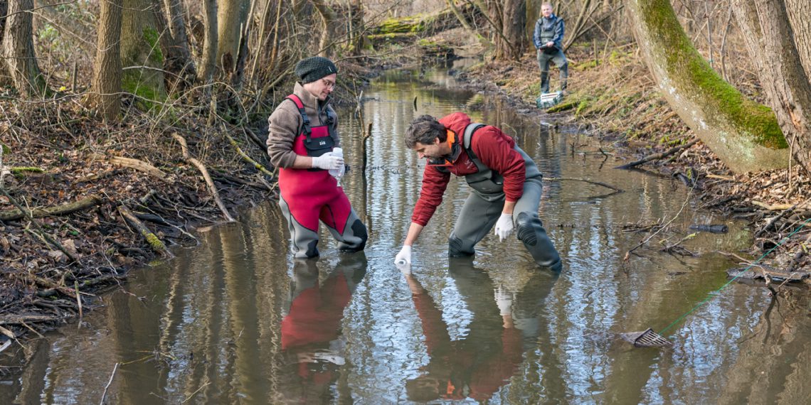 Mit der Umwelt-DNA-Analyse werden Gewässerlebewesen nachweisbar, ohne dass sie gefangen werden müssen: Bernhard Stoeckle (re.) holt sich dafür eine Wasserflasche mit Flüssigkeit aus einem Bach. (Bild: A. Heddergott/TUM)