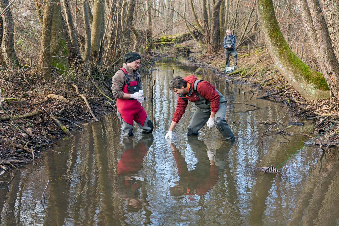 Mit der Umwelt-DNA-Analyse werden Gewässerlebewesen nachweisbar, ohne dass sie gefangen werden müssen: Bernhard Stoeckle (re.) holt sich dafür eine Wasserflasche mit Flüssigkeit aus einem Bach. (Bild: A. Heddergott/TUM)
