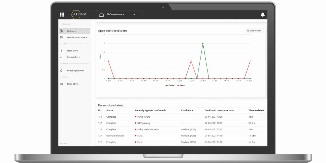 Das Tool erkennt steigende Leitungsbrüche, die zu Verschmutzungsereignissen führen können. Über ein Dashboard bietet es einen Überblick über den Status von Pumpstationen sowie über aktuelle und historische Ereignisse. Wenn die Daten auf einen potenziellen Rohrbruch hindeuten, wird eine Warnung an die Leitstellen gesendet, oft innerhalb einer Stunde nach dem Auftreten.