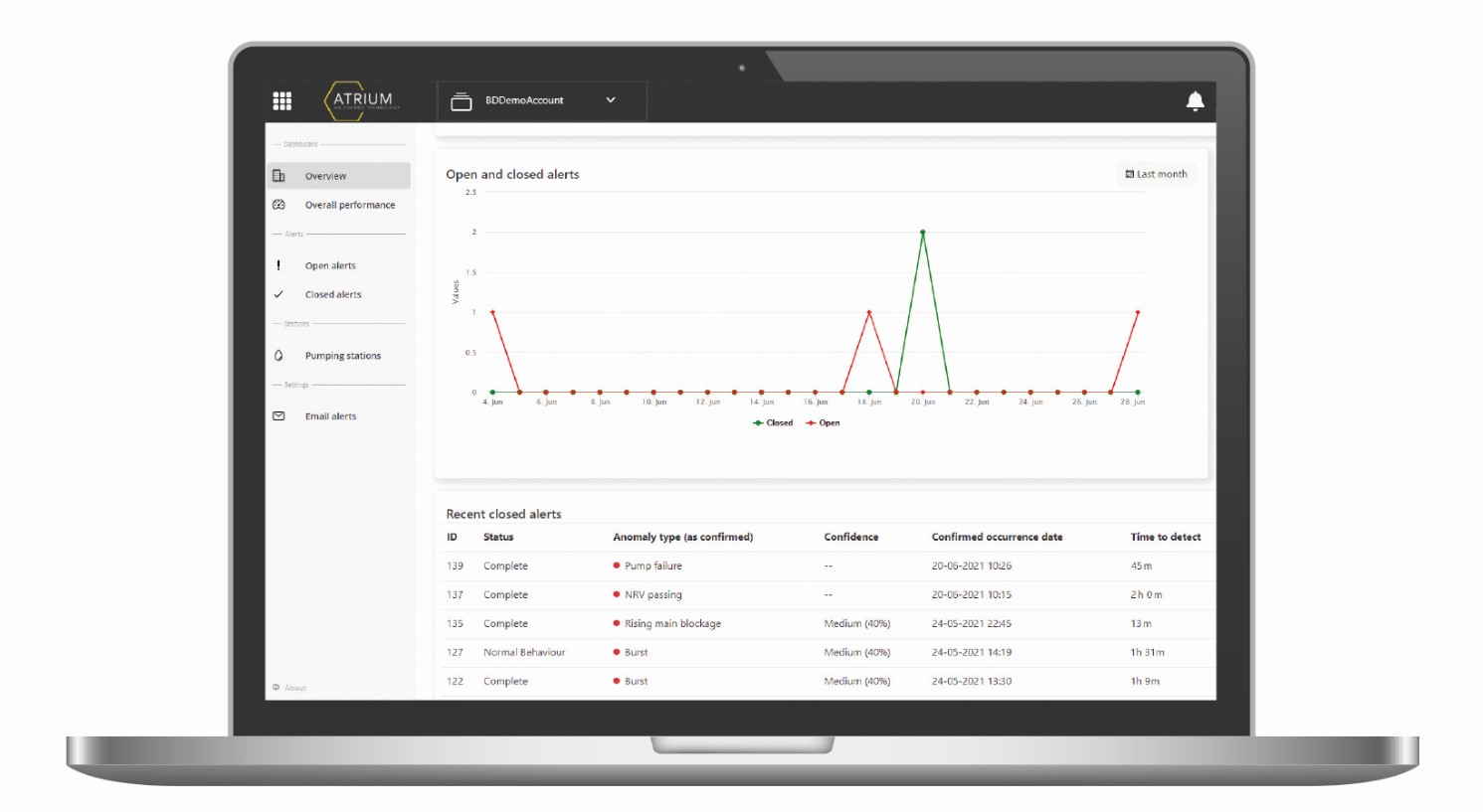 Das Tool erkennt steigende Leitungsbrüche, die zu Verschmutzungsereignissen führen können. Über ein Dashboard bietet es einen Überblick über den Status von Pumpstationen sowie über aktuelle und historische Ereignisse. Wenn die Daten auf einen potenziellen Rohrbruch hindeuten, wird eine Warnung an die Leitstellen gesendet, oft innerhalb einer Stunde nach dem Auftreten.
