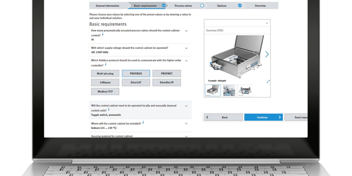 Das geht ganz einfach: Der Anlagenplaner beschreibt die Applikation und der intelligente Konfigurator erstellt ihm eine individuelle Schaltschranklösung. In nur wenigen Minuten konfiguriert der Planer im Online-Tool seinen Schaltschrank zur Ansteuerung pneumatisch betätigter Armaturen in wassertechnischen Anlagen. Dabei sind nur wenige Schritte notwendig: Eingabe der Applikation, konfigurieren, anschließend auswählen und bestellen.