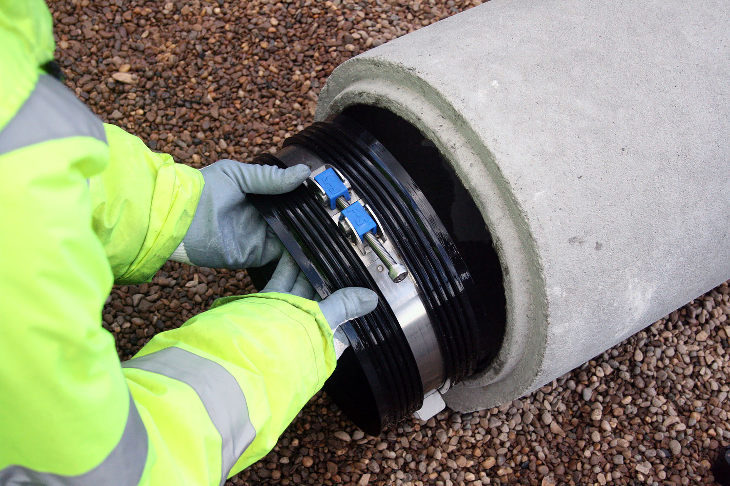 Die Manschette überzeugt außerdem mit ihrer leichten Montage in allen Größen: Außer der Dichtung benötigt der Monteur keine anderen Materialien – einfach die Manschette in das Bestandsrohr schieben, das andere Rohr darauf stecken und bis zum vorgeschriebenen Drehmoment festziehen. Die Abstandshalter am Korpus positionieren die Manschette sicher und genau zwischen den beiden Rohren. Die Verspanneinheit überträgt die notwendige Druckkraft auf die Innenfläche der Rohre. So verbindet das EPDM-Dichtelement über den hohen Anpressdruck selbst raue Innenwände von Betonrohren einwandfrei.