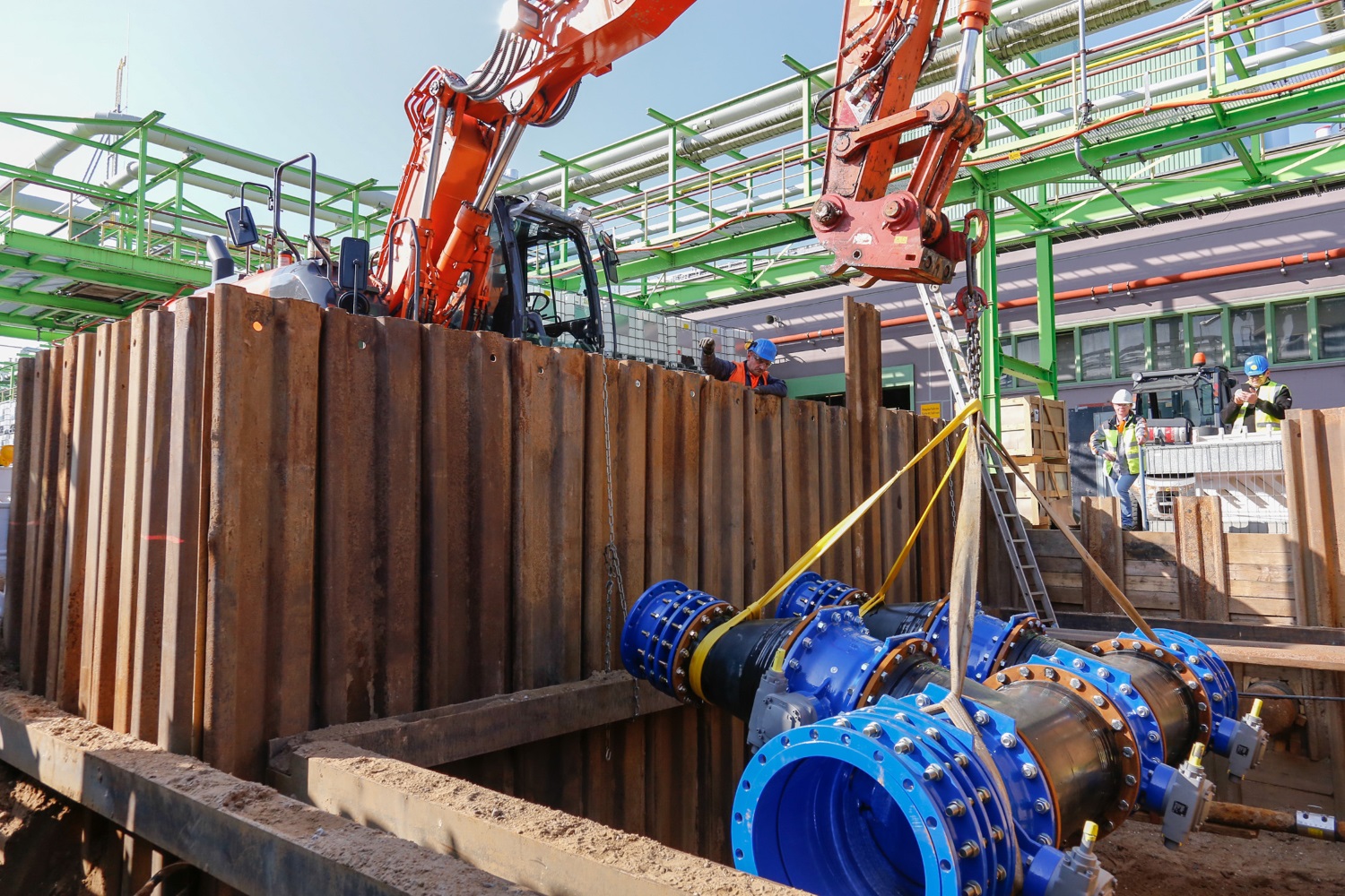 70 Mil­lio­nen Euro Gesamt­in­vesti­tion, und hier­von nun ein gewichtiger Baustein, der auch noch mehr Sicher­heit schafft: 3,7 Ton­nen Stahl haben die Rohr­net­zspezial­is­ten von Cur­renta am Dien­stag, 4. April 2017, unter die Erde gebracht. Der rund vier Meter lange Rohrknoten ist Herzstück der Löschwasserver­sorgung im Chempark. Der spek­takulär einge­hobene Stahlkoloss bildet einen weit­eren, redun­dan­ten Anschluss für einen Bay­er-Betrieb im West­teil des Werks. Redun­dant bedeutet hier: zusät­zliche Sicher­heit durch Ergänzung der beste­hen­den Löschwasserversorgung.