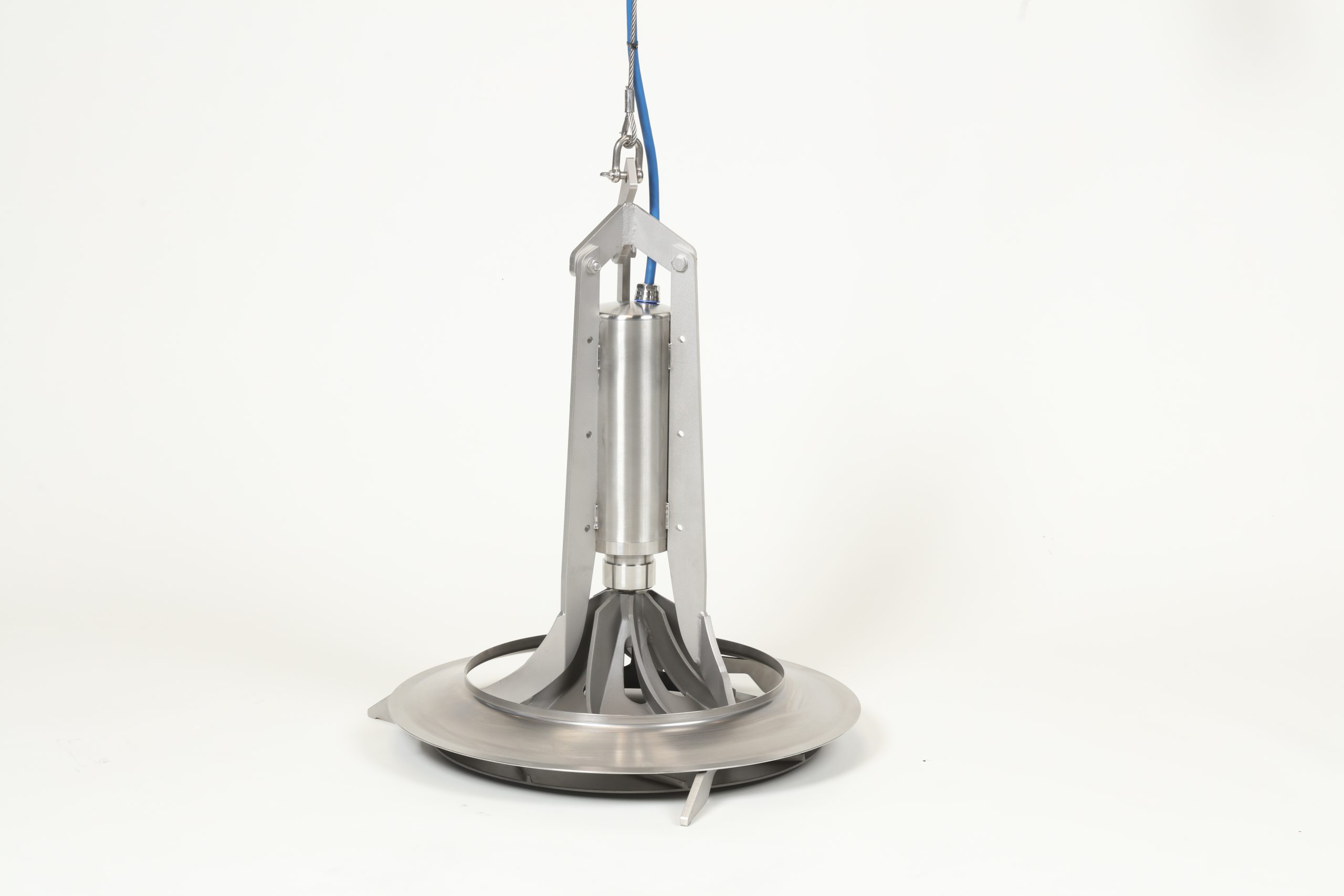 Das Hyper­mix-Rührw­erk kann ganz unkom­pliziert in Trinkwasser­spe­ich­ern instal­liert wer­den. Es wird durch die Ser­viceöff­nung am mit­geliefer­ten Edel­stahl­seil bis auf den Boden des Tanks abge­lassen. Dort ste­ht es durch sein Eigengewicht sich­er am Ein­sat­zort. Die Ans­teuerung erfol­gt über eine Smart Con­trol Steuerung, welche außen am Trinkwasser­spe­ich­er instal­liert wird. Sie kon­trol­liert die Drehzahl des Rührw­erks. Sobald sich das Rührw­erk in Bewe­gung set­zt, induziert der rotierende Hyper­boloid­kör­p­er eine Strö­mung, die am Beck­en­bo­den radi­al nach außen ver­läuft. Hier­für saugt das Rührw­erk direkt von oben aus oberen Schicht­en Flu­id an, bricht so die Schicht­en auf und homogenisiert den Beck­en­in­halt sich­er und dauer­haft. Über eine optionale Dosiere­in­heit kön­nen über eine zusät­zliche Schlauch­leitung Zusatzstoffe in flüs­siger Form in Rührw­erk­snähe hinzuge­fügt werden.
