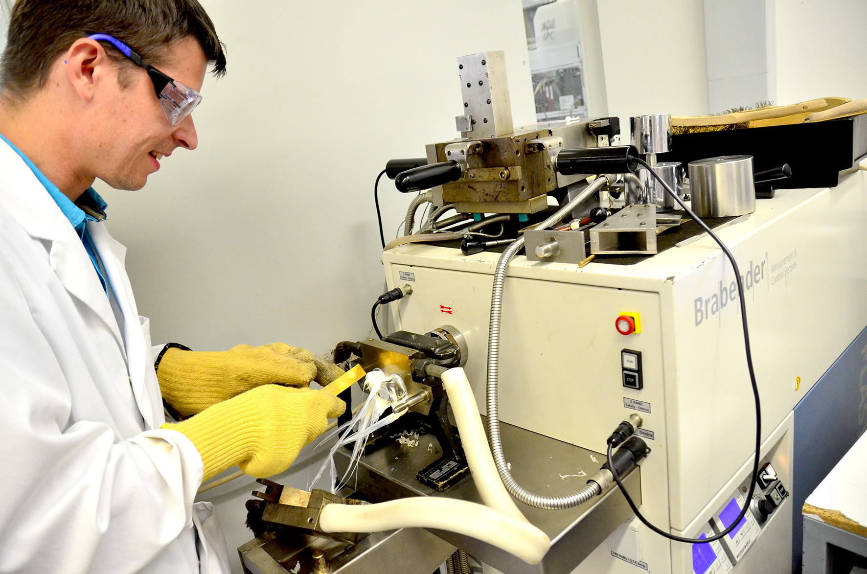 Darum verarbeitet Volhard gerade Kunststoffe und Katalysatoren in der Knetkammer des Labors für Kunststofftechnologie von Prof. Dr. Reinhard Lorenz und wird verschiedene Experimente im Labor durchführen. Die neuen Kunststoffe sollen im Idealfall nur noch maximal zehn Jahre brauchen, bis sie sich vollständig zersetzt haben. „Aber so lange kann ich ja nicht auf meine Versuche warten. Um trotzdem valide Aussagen treffen zu können, muss ich mir noch eine neue Methode zur Überprüfung einfallen lassen“, bemerkt Volhard.