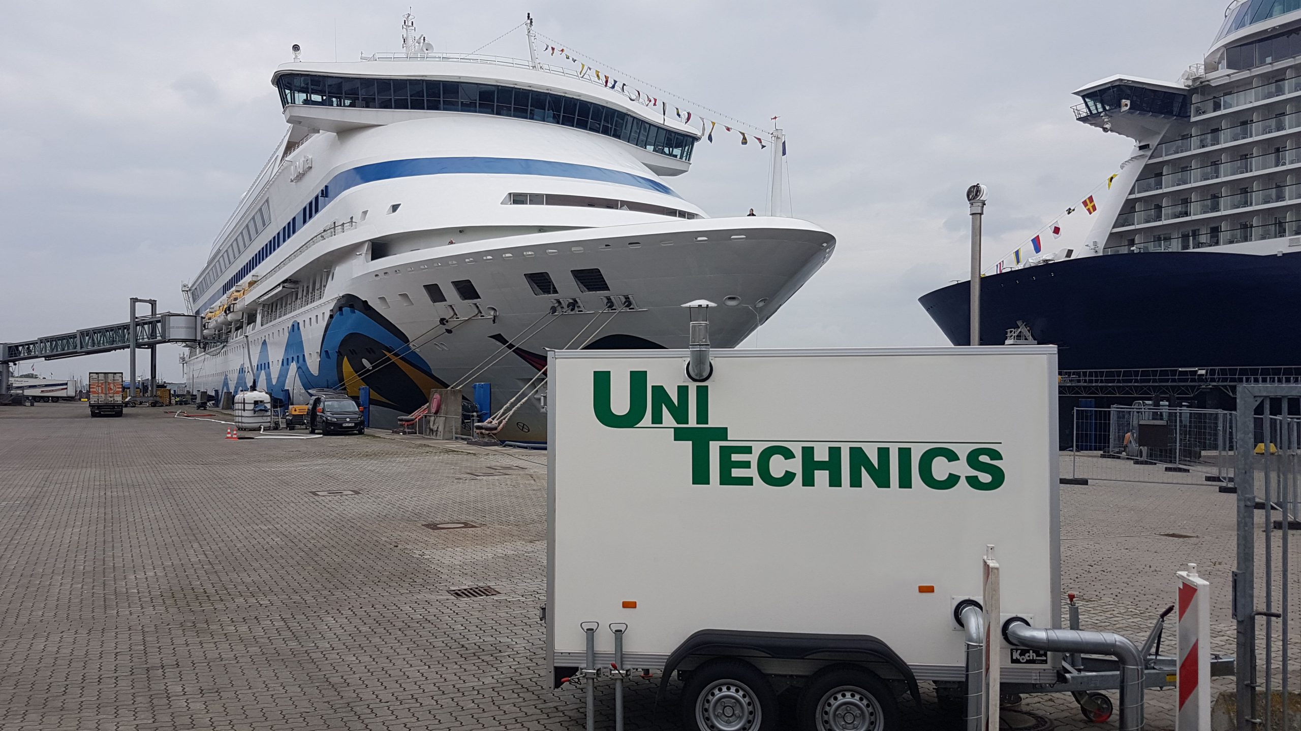Die Belüftung erfolgt dabei direkt durch Luft, welche mit Ozon angereichert ist, um einen weitest gehenden Abbau des ausgestrippten Schwefelwasserstoffs im Reaktor zu gewährleisten. Restbelastungen an Schwefelwasserstoff werden in einer nachgeschalteten Adsorbereinheit zurückgehalten, so dass über den Schornstein, welcher über der zu den Schiffen führenden Passagiergangway liegt, gereinigte und „geruchsfreie“ Reinluft abgeführt wird. Die komplette Anlagentechnik ist kompakt in einem 40 Fuß Schiffscontainer untergebracht und integriert sich dadurch in das Hafenbild.