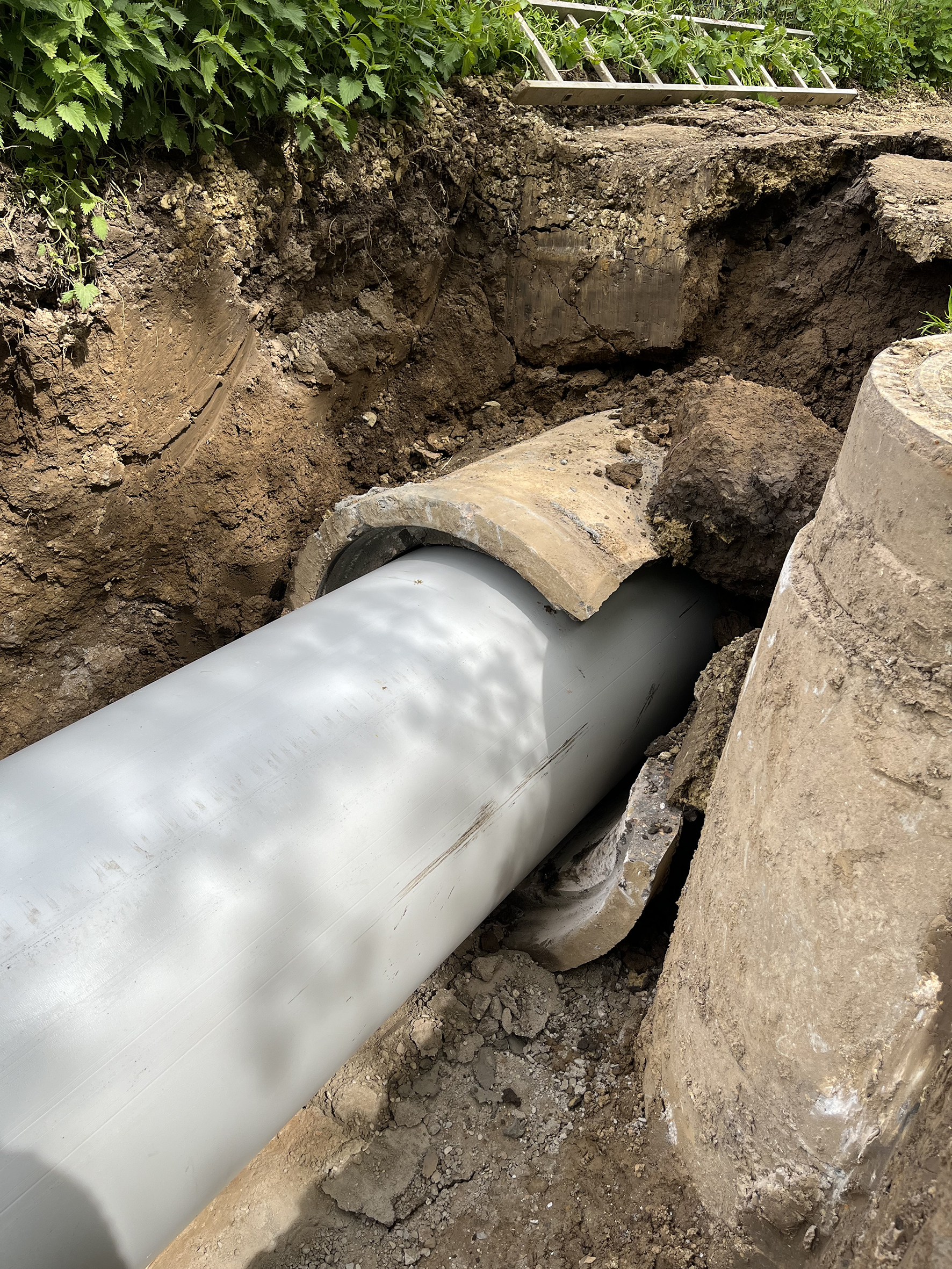 Die bewährte Methode des statischen Berstens sorgt für eine nachhaltige Erneuerung bestehender Leitungen, da heutige Materialien eine Lebensdauer von 80 bis 100 Jahren haben. Da man bis auf die Herstellung der Start- und Zielbaugrube ohne Tiefbau auskommt, entstehen keine Folgekosten durch Bodensetzungen, Straßenschäden oder Grundwasserbeeinflussung. Die kraftvollen GRUNDOBURST-Modelle von TRACTO erlauben Rohrerneuerungen bis zu einem Durchmesser von 1200mm. Zudem kann mit dem statischen Berst-Verfahren im selben Arbeitsgang die Vergrößerung der Leitungskapazität umgesetzt werden, indem wie hier in Springe neue Rohre mit größerem Durchmesser in die vorhandene Trasse eingezogen werden.