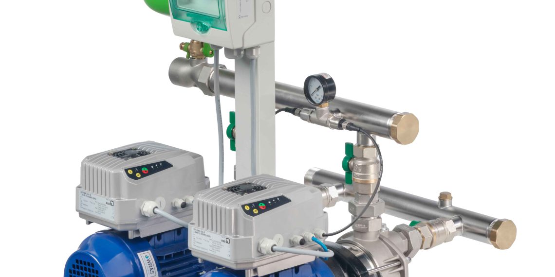 Ein oder zwei horizontale Kreiselpumpen mit Frequenzumrichter sind auf einer Grundplatte montiert. Die Drehzahlregelung aller Pumpen sorgt für eine energieeffiziente Fahrweise und hält den Druck auch bei schwankender Wasserentnahme konstant. Ein elektronischer Trockenlaufschutz für die Pumpen ist integriert.