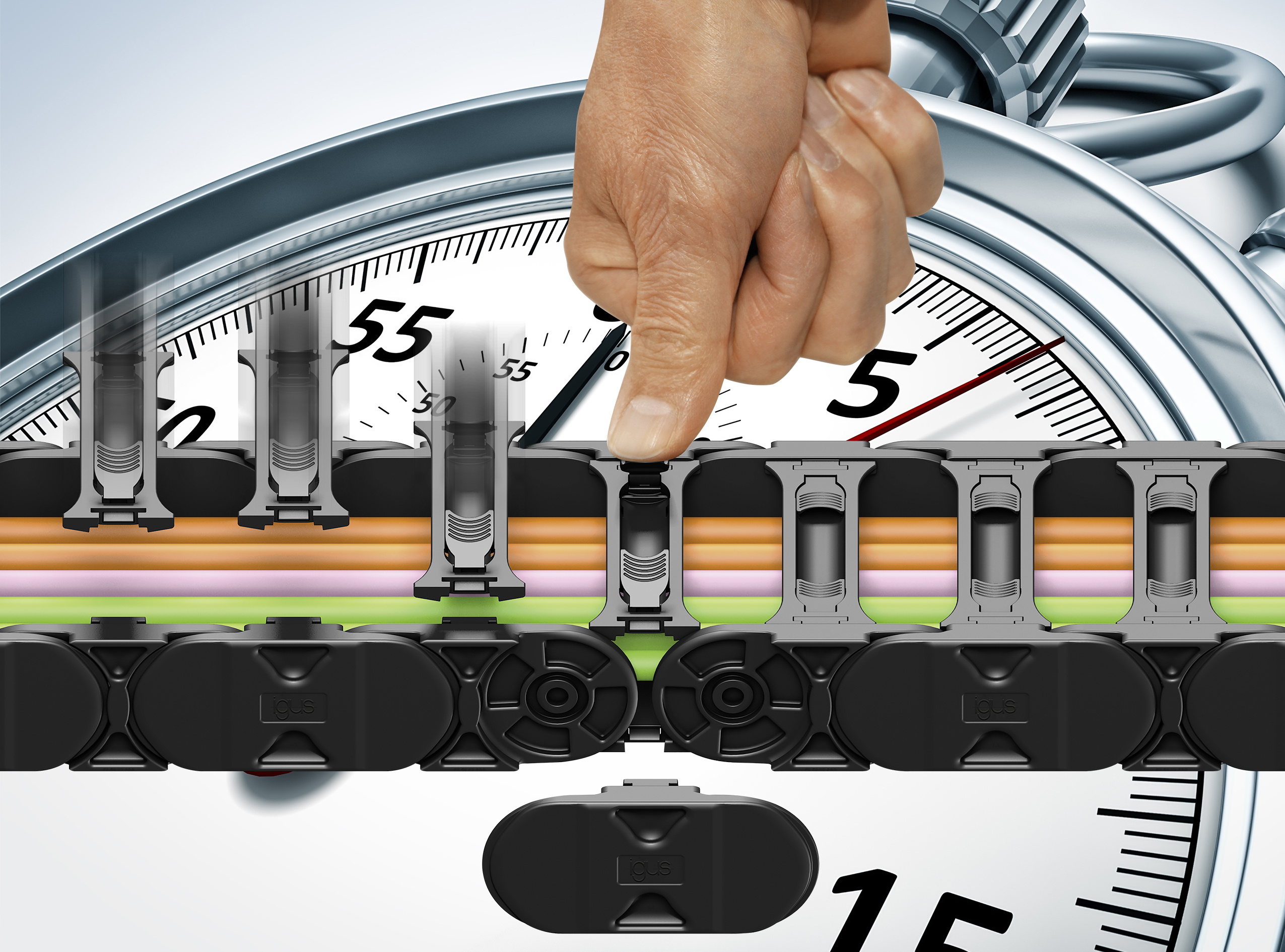 Eine weitere Besonderheit der E4Q sind ihre Öffnungsstege. Diese lassen sich komplett ohne Werkzeug öffnen und schließen. Auf der Oberseite des Stegs befinden sich dafür zwei Mulden für die Finger, mit denen die Verschlusshaken einfach aufgezogen werden können. An beiden Seiten entriegelt, lässt sich der Öffnungssteg mit geringem Kraftaufwand nach oben entnehmen. Dies ermöglicht das einfache Öffnen und Schließen der Kette auch in einer Führungsrinne und beschleunigt die Befüllung der e‑kette um bis zu 40 Prozent. Ein weiterer Vorteil: der neue Öffnungssteg besitzt durch seine neuartige Bauform im verriegelten Zustand deutlich höhere Ausreißkräfte als bei vergleichbaren e‑ketten.