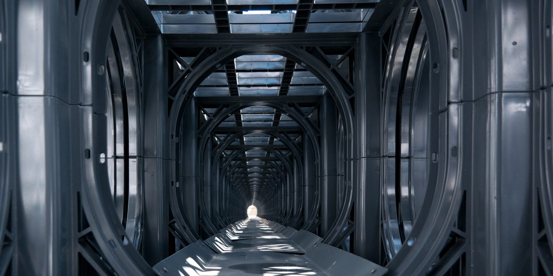 Die grauen Ele­mente des Sys­tems beste­hen aus PVC‑U und ver­fü­gen über die Abmes­sun­gen 600 x 600 x 600 mm. Der Umstand, dass die Spe­icher­fähigkeit des Sys­tems bei 97% liegt, während eine übliche Kies- oder Schot­ter­rigole nur unge­fähr 30% bis 35% erre­icht, hat auch dazu beige­tra­gen, dass der Rain­tank bei der Auswahl eines geeigneten Pro­duk­tes punk­ten kon­nte. Zukün­ftig wird das anfal­l­ende Nieder­schlagswass­er von Dachflächen und Grund­stück­en in eine Großrigole geleit­et, die sich über das gesamte Bebau­ungs­ge­bi­et erstreckt. Bei dem rund 300 m lan­gen Rigolenkör­p­er sind die Ele­mente in drei Rei­hen nebeneinan­der und zweilagig übere­inan­der ange­ord­net. Ein zweit­er, kleiner­er Rigolenkör­p­er befind­et sich unter einem Spielplatz in der Mitte des Neubauge­bi­etes. Auch hier liegen die Ele­mente in drei Rei­hen nebeneinan­der und zweilagig übere­inan­der. Die Rigole wird später das von den Straßen abfließende Regen­wass­er aufnehmen.