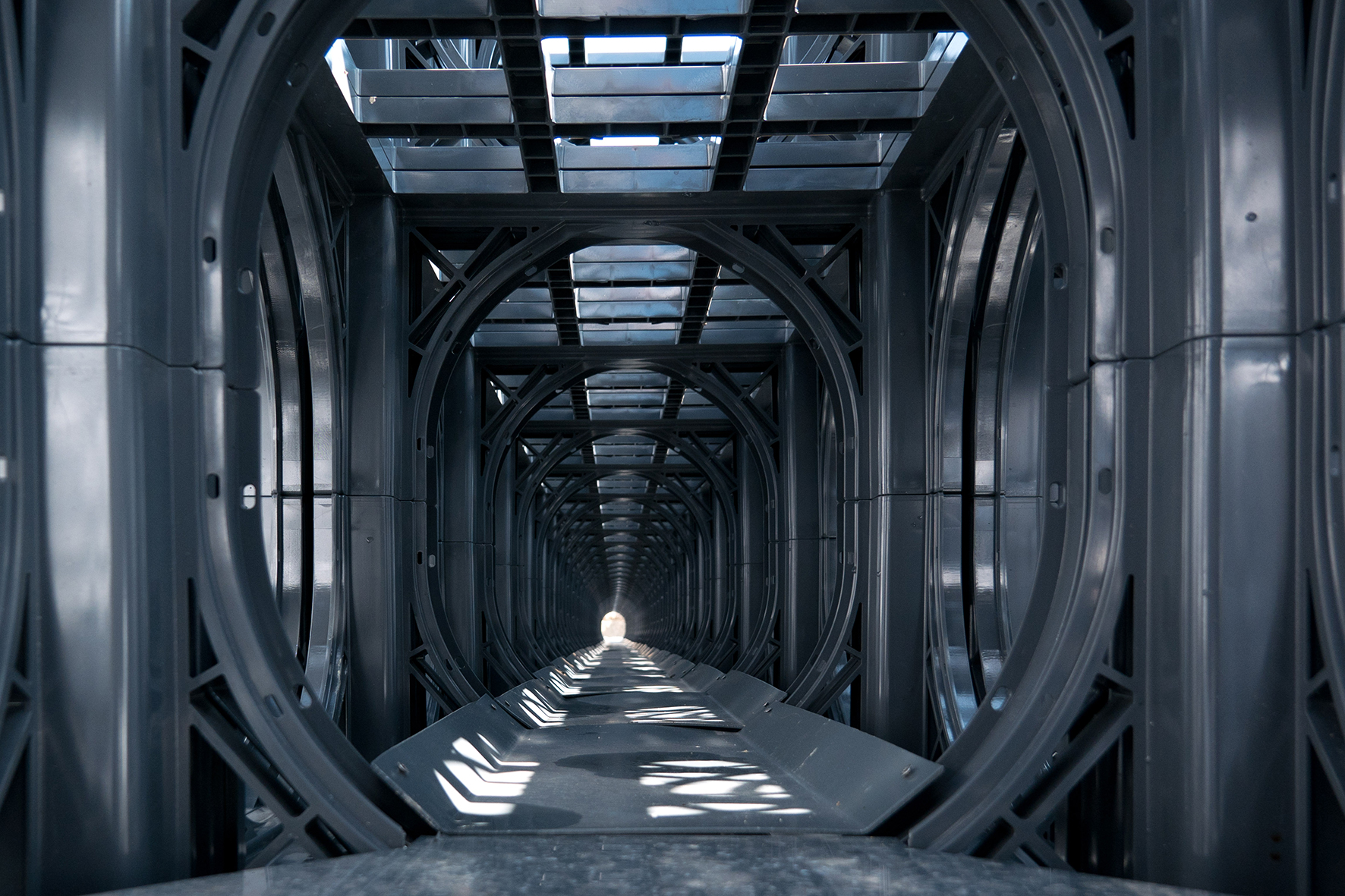 Zu Inspek­tions- und Reini­gungszweck­en sind die Rigolenkör­p­er mit Inspek­tions­blöck­en und Reini­gungsöff­nun­gen aus­ges­tat­tet. In geschlitzten Spül­rohren, die in den mit­tleren Ele­menten ver­laufen, sam­meln sich die mit­ge­führten Fest­stoffe an der Rohrsohle, während das Wass­er aus den Schlitzen ablaufen kann. Mit regelmäßig durchge­führten Spülun­gen kön­nen diese Fest­stoffe aus den Rohren aus­ge­spült wer­den. Darüber hin­aus wurde jew­eils eine Längsrei­he der Rigolenkör­p­er aus soge­nan­nten Inspek­tions­blöck­en erstellt. Sie sind mit ein­er Schiene aus­ges­tat­tet, die auch den Ein­satz von Fahrwa­genkam­eras mit kleinen Rädern ermöglichen.
