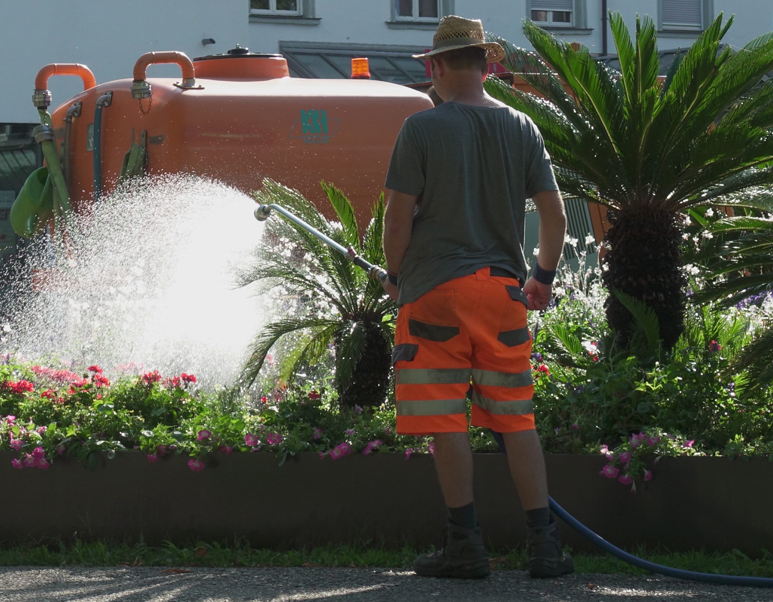 Ist dieser voll, stehen 60 Kubikmeter Niederschlagswasser zum Befüllen der beiden Bewässerungsanhänger mit 2200 und 3000 Litern Fassungsvermögen bereit. Sie werden von Traktoren gezogen. In trockenen Wochen sind beide Gespanne gleichzeitig im Einsatz. Dann müssen innerstädtische Grünflächen bewässert werden, teilweise auch die darin neu gepflanzten Gehölze. Allein im Jahr 2024 kamen durch Ausgleichsmaßnahmen für drei ausgewiesene Baugebiete 550 Bäume dazu.