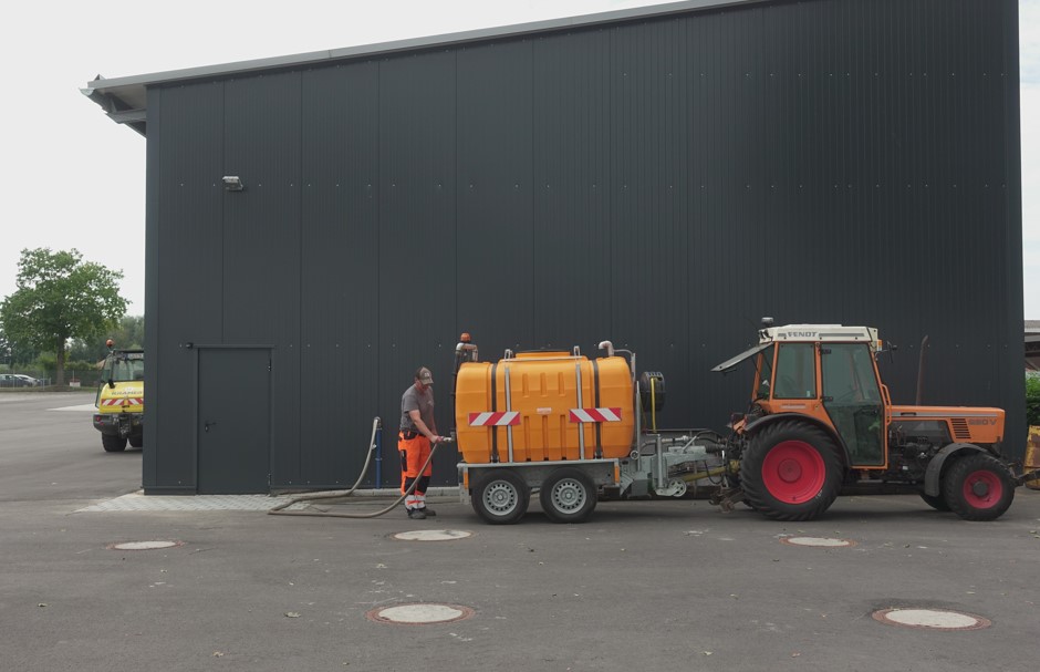 Eine Anlage zur Regenwassernutzung ist Stand der Technik. Sie besteht aus Sammelleitungen mit Filter und Speicher, einem Überlauf, einem Leitungssystem zu den Entnahmestellen sowie der Pumpentechnik mit automatischer Trinkwasser- oder Brunnenwasser-Nachspeisung, falls der Vorrat aufgebraucht ist. Regenwasser von Natur aus frei von gelöstem Kalk – ein großer Vorteil für die Schläuche, Ventile, Pumpen und Behälter der Tankfahrzeuge. Denn Ablagerungen beeinträchtigen den Betrieb und erfordern von Zeit zu Zeit eine Reinigung. Wo das weiche Wasser zur Reinigung von Glasflächen oder Fahrzeugen genutzt wird, entfallen die sonst üblichen Nacharbeiten zum Abwischen des Kalkschleiers.