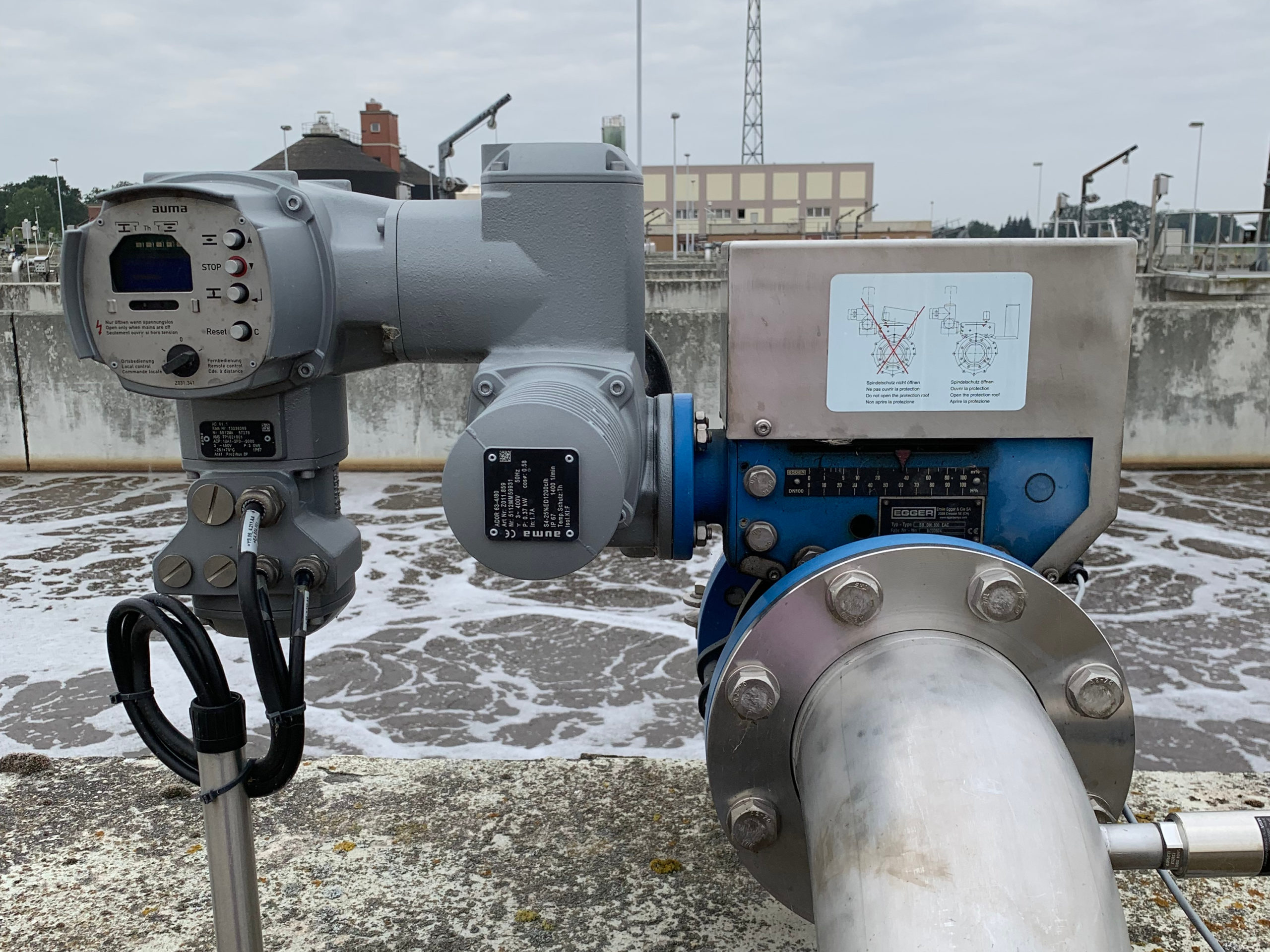 In der Kläranlage Stendal wurden 20 Regelklappen durch Iris Blenden-Regulierschieber DN 100 von Egger ersetzt. Mit dieser Maßnahme konnte eine Verbesserung der Sauerstoffregelgenauigkeit erreicht werden. Die gemessenen gelösten O2-Konzentrationen bewegen sich ± 0,04 Milligramm pro Liter um den Sollwert. Die exakte Regelung und die Ausnutzung des großen Regelbereichs der Iris Blenden ermöglichte eine Reduzierung des Verdichterdrucks. Bei der eingesetzten Gleitdruckregelung konnte dieser bis auf 29 mbar über dem statischen Druck (Einblastiefe) reduziert werden. Die Blenden-Regulierschieber arbeiten dabei bei einem optimalen Öffnungsgrad zwischen 70 und 95 Prozent. Die hohe Regelgüte und Wiederholgenauigkeit wirken sich positiv auf den Gesamtprozess sowie auf den Energiebedarf der Belebung aus. Neben den wirtschaftlichen Vorteilen können die Membranbelüfter aufgrund der höheren Durchflusskapazität der Iris Schieber wirkungsvoller gespült werden.