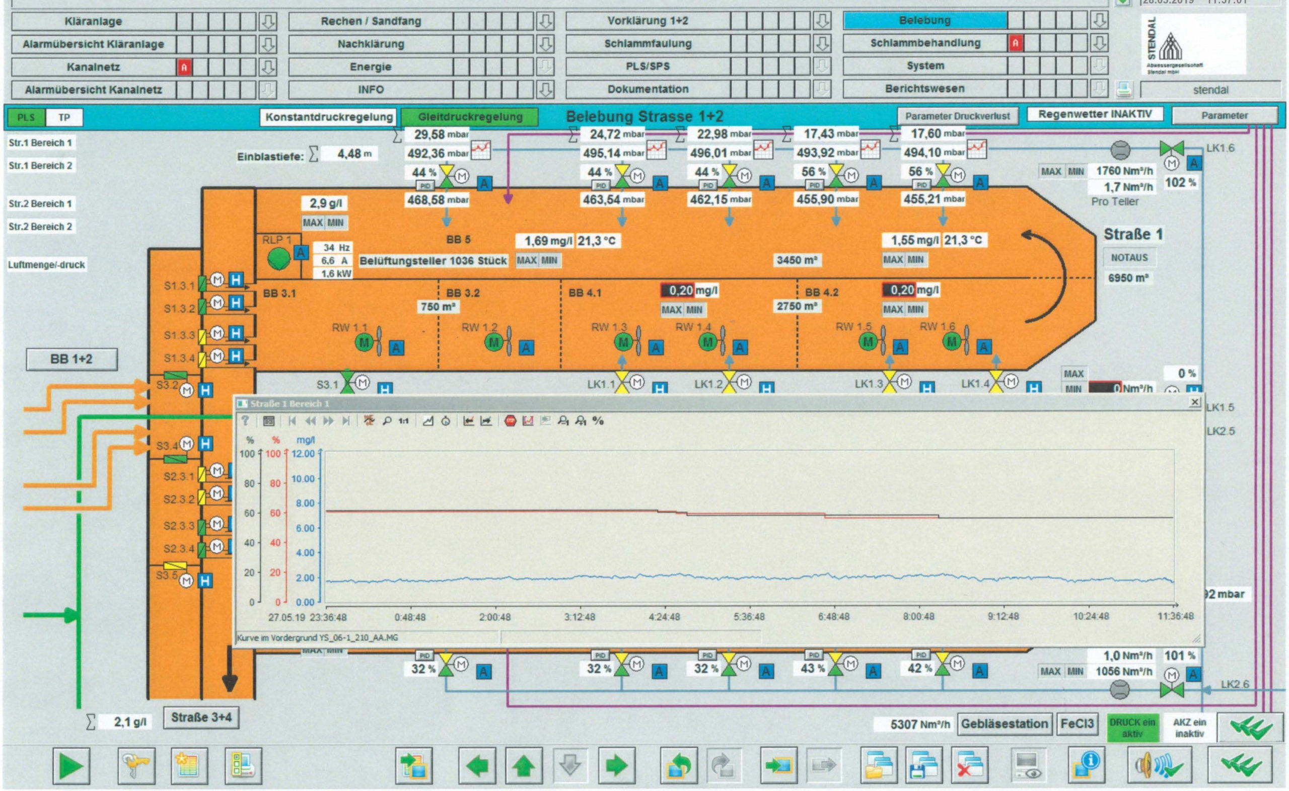 Die Programmierung des Prozessleitsystems für die Belebungsluftregelung erfolgte durch die Firma S & W Automatisierung Prozeßleittechnik in Zusammenarbeit mit der Kläranlage Stendal. Es wurden eine Konstantdruckregelung sowie eine Gleitdruckregelung programmiert. Das System ist so konzipiert, dass die Kläranlage zwischen den beiden Regelungsarten wechseln und Parameter individuell anpassen kann. Hierdurch kann das Potential des Systems optimal ausgenutzt werden. Der Sauerstoffgehalt schwankt zwischen 1,78 bis 1,84 Milligramm pro Liter bei einem Vorgabewert von 1,8 Milligramm pro Liter.