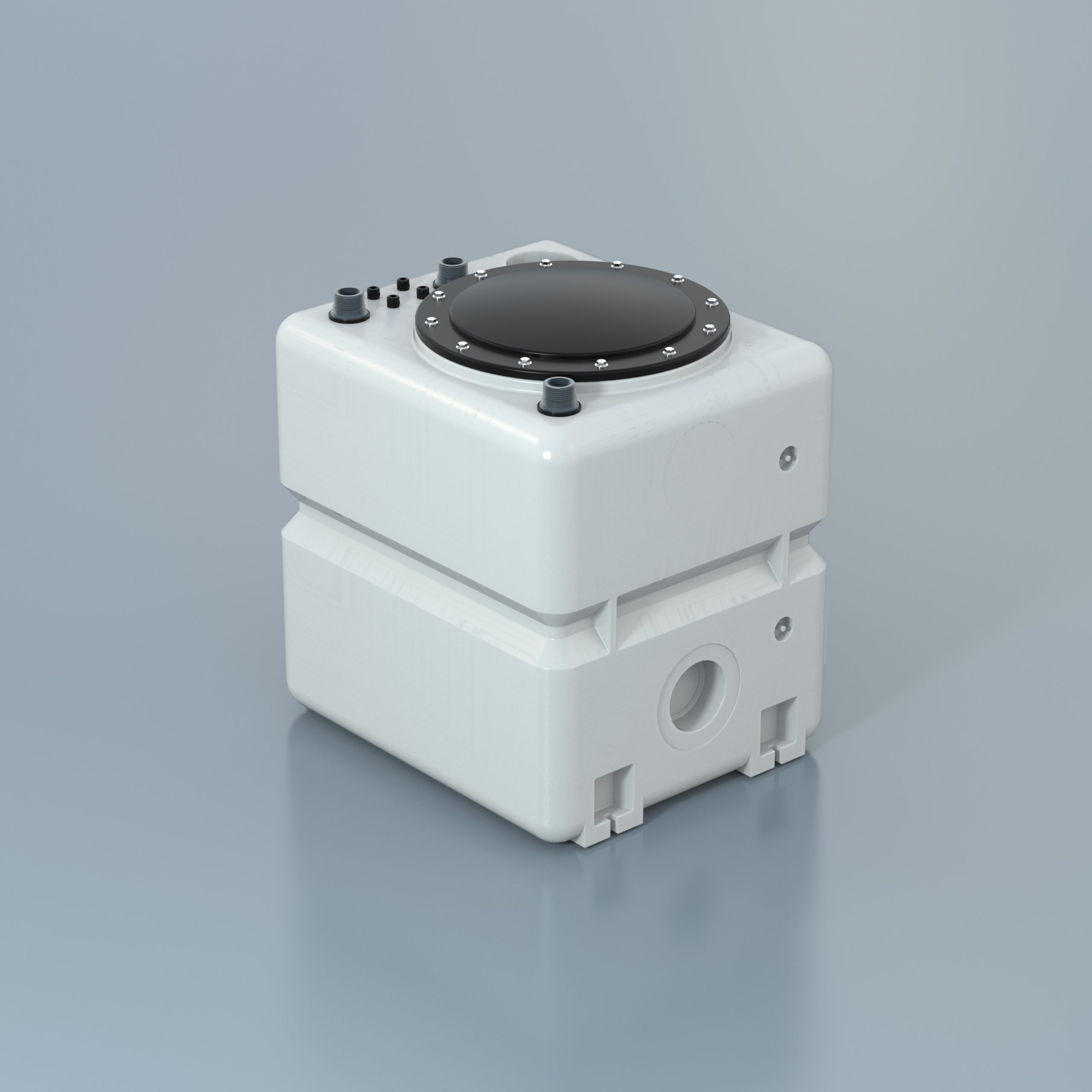 PG-Kabelverschraubungen sowie als Muffe ausgeführte Zulaufanschlüsse auf drei Behälterseiten (zwei seitlich, einer oben angeordnet, jeweils in DN 100) ermöglichen einen flexiblen Einsatz. Dabei sind die Zuläufe auf drei unterschiedlichen Niveaus angebracht (180 mm, 520 mm und 700 mm). Die muffenförmige Ausführung der Zuläufe ermöglicht eine einfache Verbindung bei räumlich begrenzter Aufstellung, zudem ist ein Muffenanschluss DN50 ist für den Anschluss einer Handmembranpumpe vorhanden.