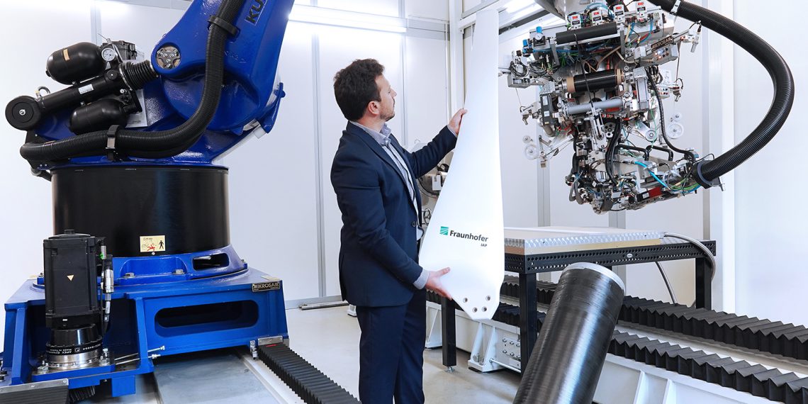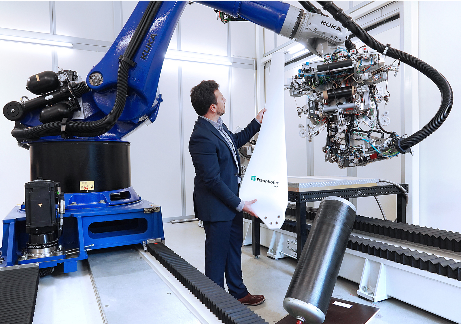 Faserverbundwerkstoffe werden gefertigt, indem man Faserstreifen präzise in eine Form einlegt und dann mit Hilfe eines Harzes oder anderer Kunststoffe zum Bauteil aushärtet. Oftmals wird das Verlegen per Hand durchgeführt. Am Fraunhofer IAP aber übernimmt diese Aufgabe eine moderne Automated-Fibre-Placement-Anlage, die die Verstärkungsfasern präzise in der Form platziert. Ambrosio: »Anders als beim Verlegen per Hand gibt es hier weniger Überlappungen, sodass wir deutlich die Maße reduzieren können.«