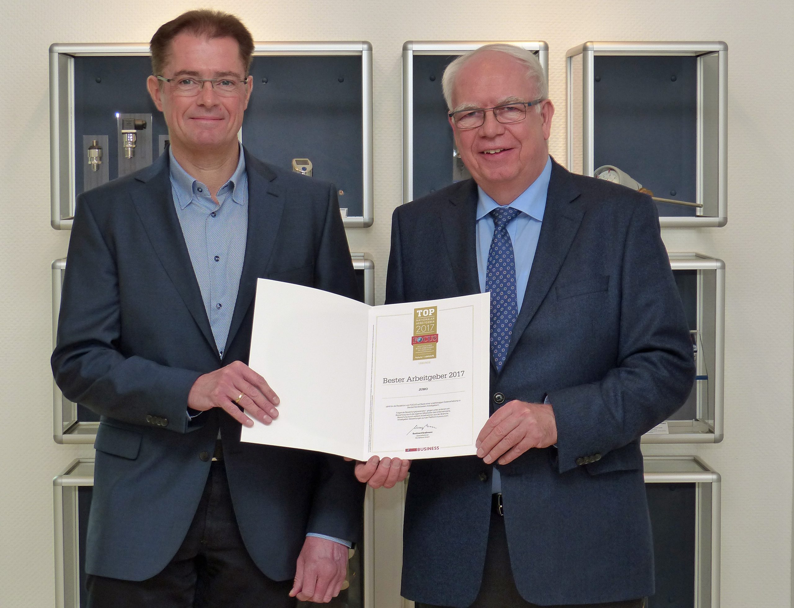 Auch Michael Juch­heim, der mit seinem Vater das Unternehmen führt, freut sich über die Ausze­ich­nung und ver­weist auf das her­vor­ra­gende Abschnei­den im Branchen­rank­ing. „In der Branche ‘Elek­tron­ik, Elek­trotech­nik, medi­zinis­che Geräte‘ wur­den 63 Unternehmen unter­sucht, wobei zusät­zlich zwis­chen großen Unternehmen mit mehr als 2.000 Mitar­beit­ern und mit­tleren Unternehmen mit bis zu 2.000 Mitar­beit­ern in Deutsch­land dif­feren­ziert wurde. Im gesamten Branchen­rank­ing kam JUMO auf den neun­ten Platz, bei den mit­tleren Unternehmen sog­ar auf den dritten.“