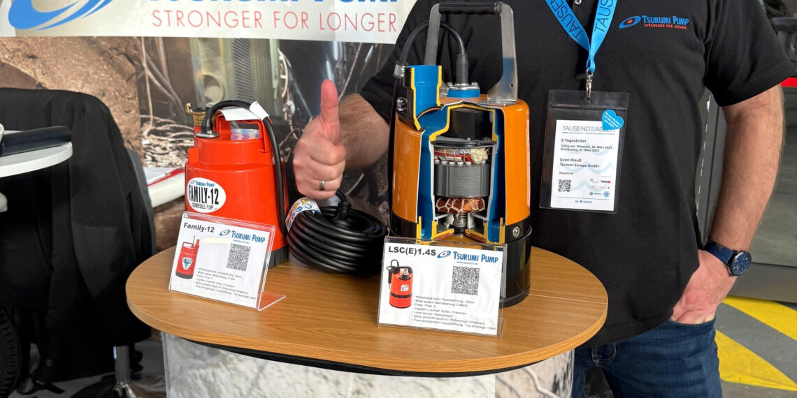 Der Pumpen­spezial­ist Tsu­ru­mi hat auf der Messe Tausend­wass­er in Berlin seine kle­in­sten Pumpen vorgestellt: ein­phasige Pumpen für Schmutzwass­er, die uni­versell ein­set­zbar sind.