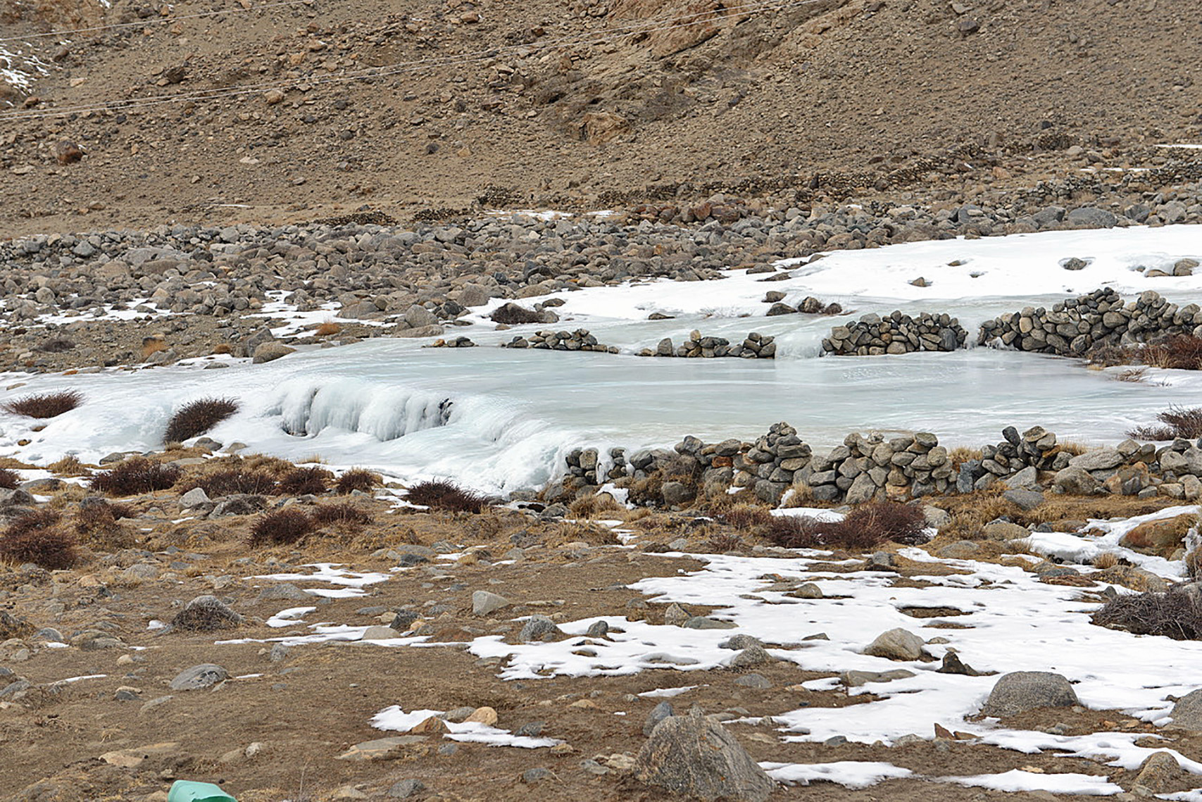 „Vereinzelt wird dieser Prozess durch das Errichten von Steinmauern gezielt verstärkt. Diese künstlich angelegten Reservoire werden in einigen Seitentälern des oberen Indus genutzt, um die saisonal auftretende Wasserknappheit im Frühjahr zu überbrücken. Das genaue Vorkommen, die Größe und die Anzahl der natürlich vorkommenden Aufeis-Felder war bislang jedoch unbekannt.”