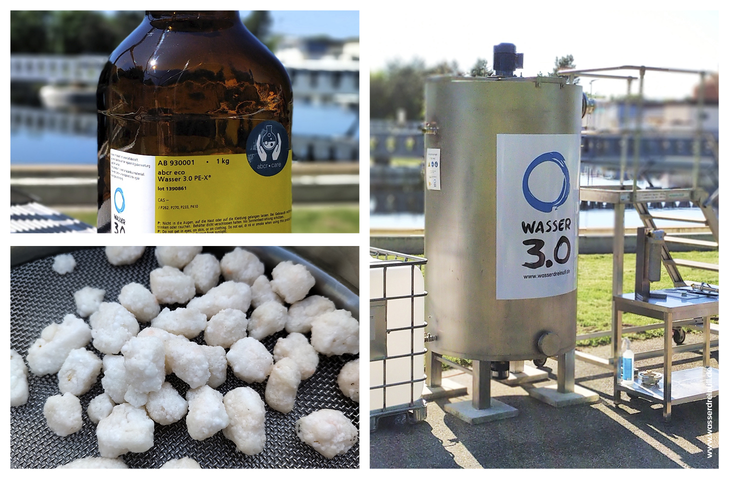 Wasser 3.0 PE‑X® ist eines der ersten filterfreien Verfahren zur Entfernung von Mikroplastik und/oder Mikroschadstoffen wie Pharmazeutika, Schwermetalle, PFAS und Pestizide aus Wässern. Bei Wasser 3.0 treffen high-tech Materialien auf low-tech Anlagendesign. Basierend auf Green Chemistry bilden drei Konzepte die Grundlage eines modularen und einfach skalierbaren Baukastensystems. Der Clou: Die Agglomerate schwimmen an der Oberfläche und können leicht abgeschöpft werden. In jeder Art von Wasser, wie kommunale und industrielle Abwässer, Prozess‑, Grund- und Oberflächenwasser oder Meerwasser, werden mit Wasser 3.0 PE‑X® Entfernungsraten von reproduzierbar > 95 % erreicht, unabhängig von Polymertyp, pH-Wert und Schadstoffkonzentration.