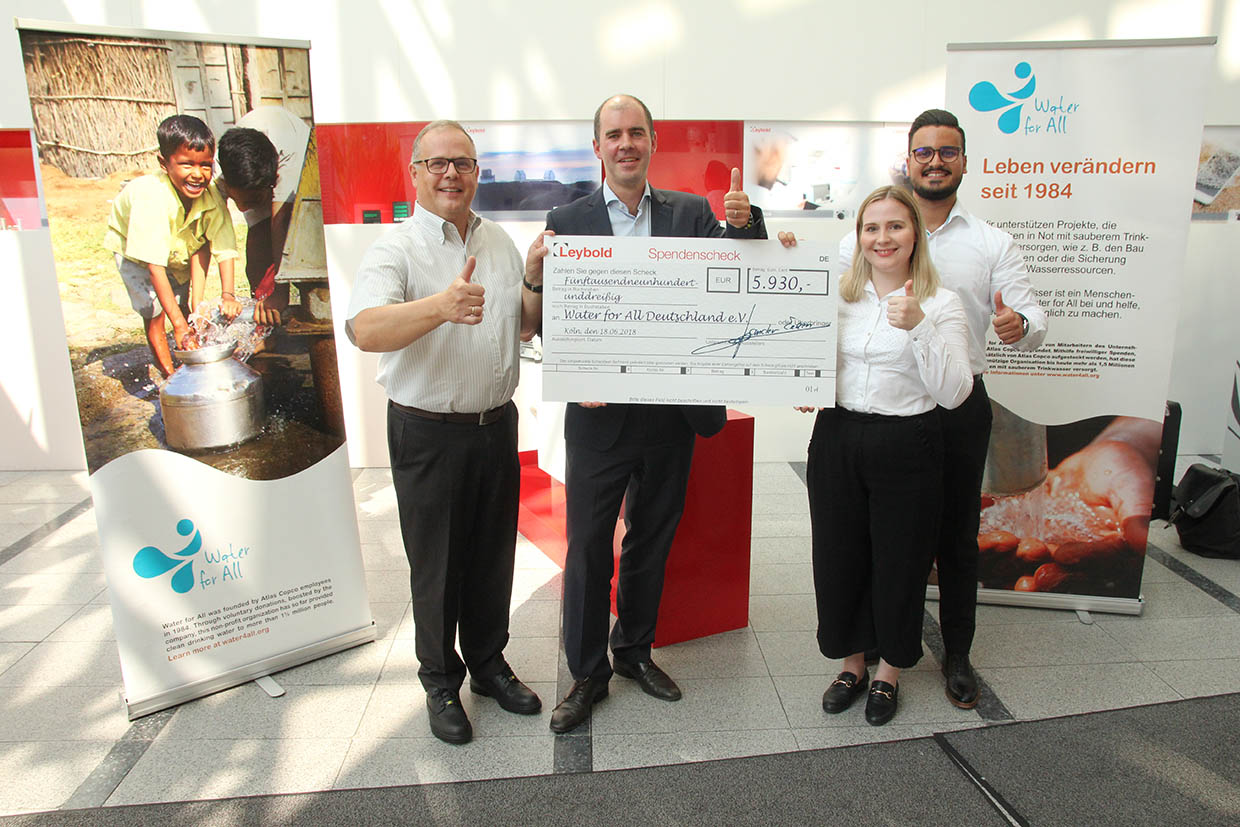 Leybold-Geschäftsführer Johan Van der Eeken und Projektmanager Stephan Hohenadl übergaben am 22. August 2018 einen Spendenscheck über 5.930,- Euro an Eva Heemann und Cemre Altinsoy von der Mitarbeiter-Initiative “Water for All” (Wasser für Alle). Seit 1984 unterstützt Water for all Projekte, die Menschen in Not Zugang zu sauberem Trinkwasser, sanitären Einrichtungen und Hygiene ermöglichen. Es ist die wichtigste gemeinnützige Initiative von Atlas Copco und sie wird durch freiwillige Mitarbeiterspenden finanziert. Insgesamt haben inzwischen mehr als zwei Millionen Menschen dank Water for All Zugang zu sauberem Trinkwasser erhalten. Auch wurden mit den Spendengeldern über die Welthungerhilfe zuletzt die Rohingya-Flüchtlinge in Bangladesch unterstützt. Langfristig stehen nachhaltige Wasserversorgungs- und Hygieneprojekte vor allem in Afrika im Focus.