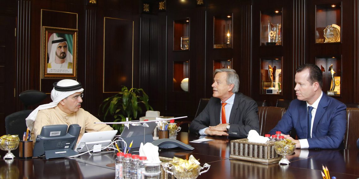 Saeed Mohammed Al Tay­er, Vice Chair­man des Dubai Supreme Coun­cil of Ener­gy und Geschäfts­führer & CEO der Dubai Elec­tric­i­ty and Water Author­i­ty (DEWA) empf­ing den Wilo-Vor­standsvor­sitzen­den und CEO Oliv­er Her­mes gemein­sam mit dem deutschen Botschafter der Vere­inigten Ara­bis­chen Emi­rate in Abu Dhabi, Götz Lingenthal.