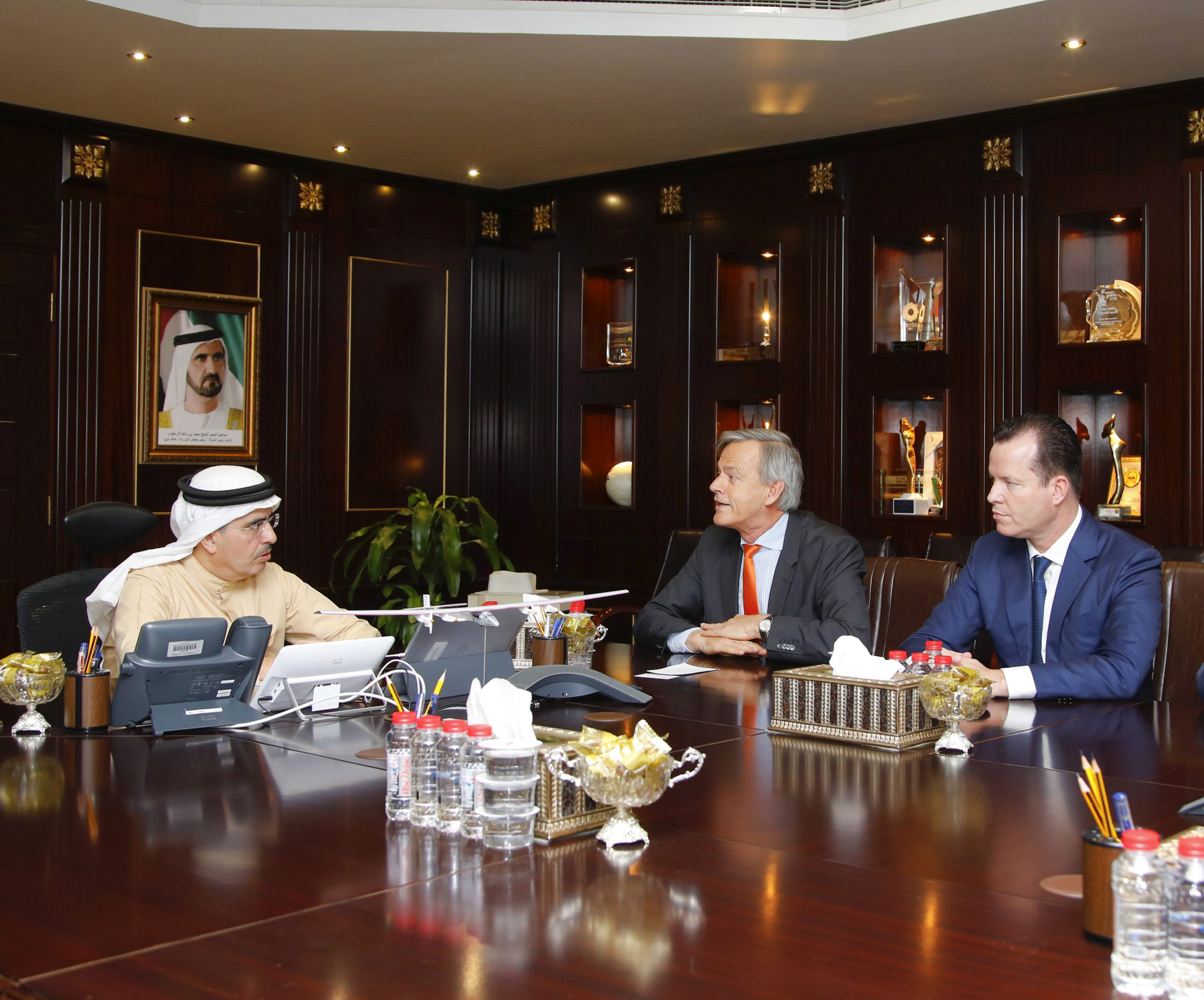 „Wir freuen uns sehr über den Aus­tausch mit Saeed Al Tay­er und über die Aus­sicht, in Dubai mit der DEWA in zukun­ft­sori­en­tierten Pro­jek­ten zusam­men zu arbeit­en“, sagt Oliv­er Her­mes im Anschluss an das Meet­ing. Ziel der DEWA ist es, mit Entwick­lung­spro­jek­ten und strate­gis­chen Ini­tia­tiv­en in Dubai die Vision von Sheikh Mohammed bin Rasshid Al Mak­toum, Vizepräsi­dent und Pre­mier­min­is­ter der Vere­inigten Ara­bis­chen Emi­rate und Herrsch­er von Dubai, umzuset­zen. Dubai soll ein glob­ales Zen­trum für effiziente Energie- und Wasser­wirtschaftssys­teme wer­den. Das Unternehmen hat nach eige­nen inter­na­tionalen Bench­marks gegen große amerikanis­che und europäis­che Ver­sorg­er in punk­to Effizienz und Zuver­läs­sigkeit in der Energie- und Wasserver­sorgung über­durch­schnit­tlich gut abgeschnit­ten. „Wir streben eine enge strate­gis­che Koop­er­a­tion mit deutschen Her­stellern und Organ­i­sa­tio­nen in den Feldern Energie- und Wasser­wirtschaft an, um aus der Zusam­me­nar­beit und dem inter­na­tionalen Erfahrungsaus­tausch für bei­de Seit­en Nutzen zu ziehen“, fasst Saeed Mohammed Al Tay­er zusammen.